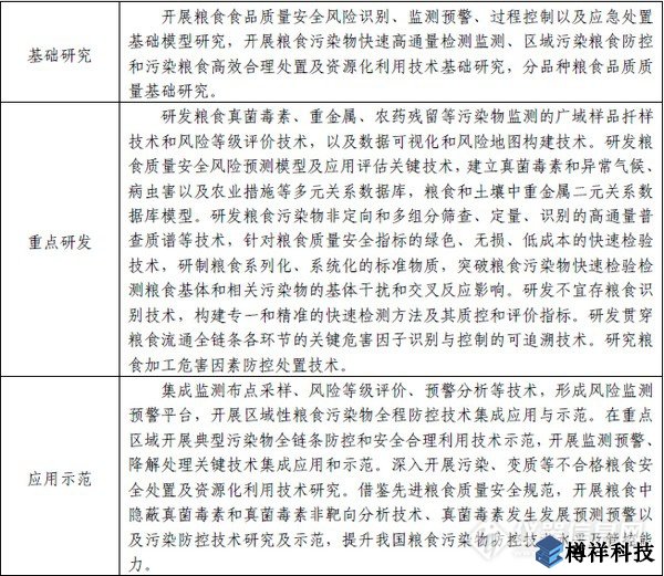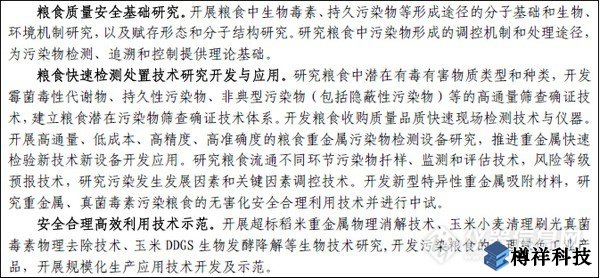在糧食質量安全保障技術研發方面,重點研究糧食污染的外界因素和內在機制,揭示污染物形成和轉化規律的分子生物學和環境生態學基礎,為糧食污染預防控制提供基礎理論。突破潛在污染物篩查技術難點,構建識別模型和篩查數據庫,建立識別和防控技術體系,提***潛在風險發現能力。建立以全產業鏈風險分析為基礎的扦樣、監測規程,解決扦樣的科學性和代表性問題。加強污染、變質等不合格糧食安全處置及資源化利用技術研發。建立污染糧食無二次污染處理技術體系,提***資源合理利用和轉化效率。