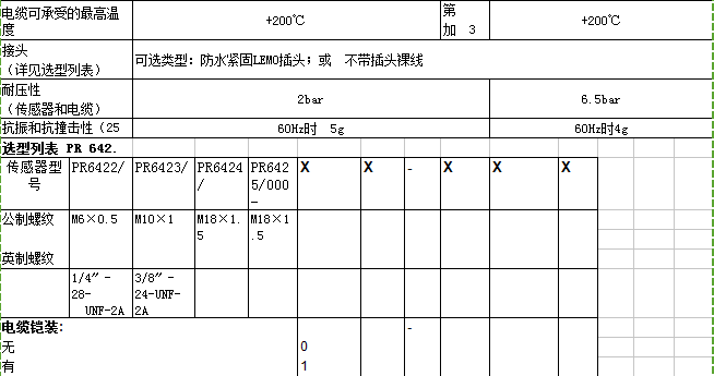 根據型號的不同,傳感器可有以下選擇:不同螺紋長度電纜的末端可選擇自鎖式防水接頭或裸線方式電纜可選擇鎧裝或非鎧裝1 m電纜處可選擇有接頭或無接頭。