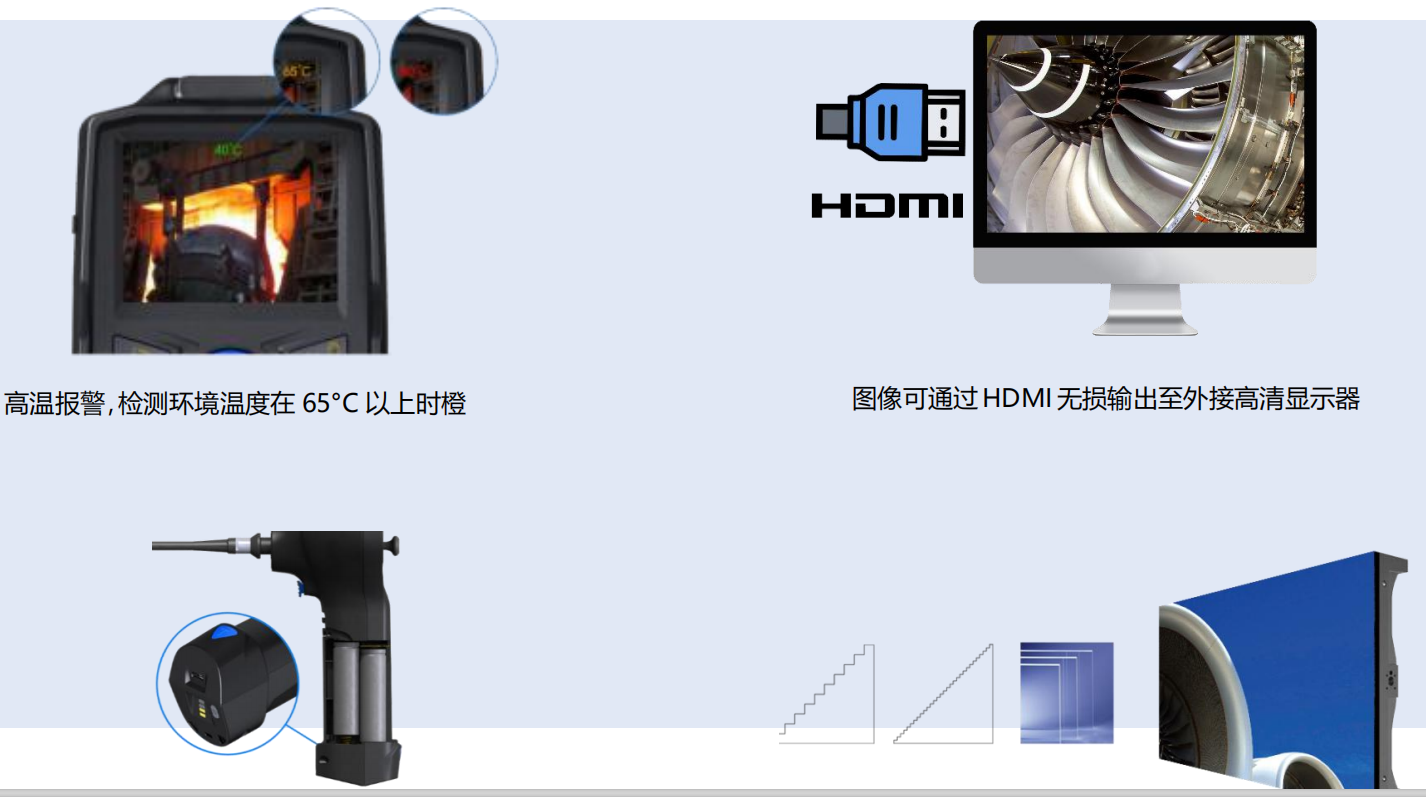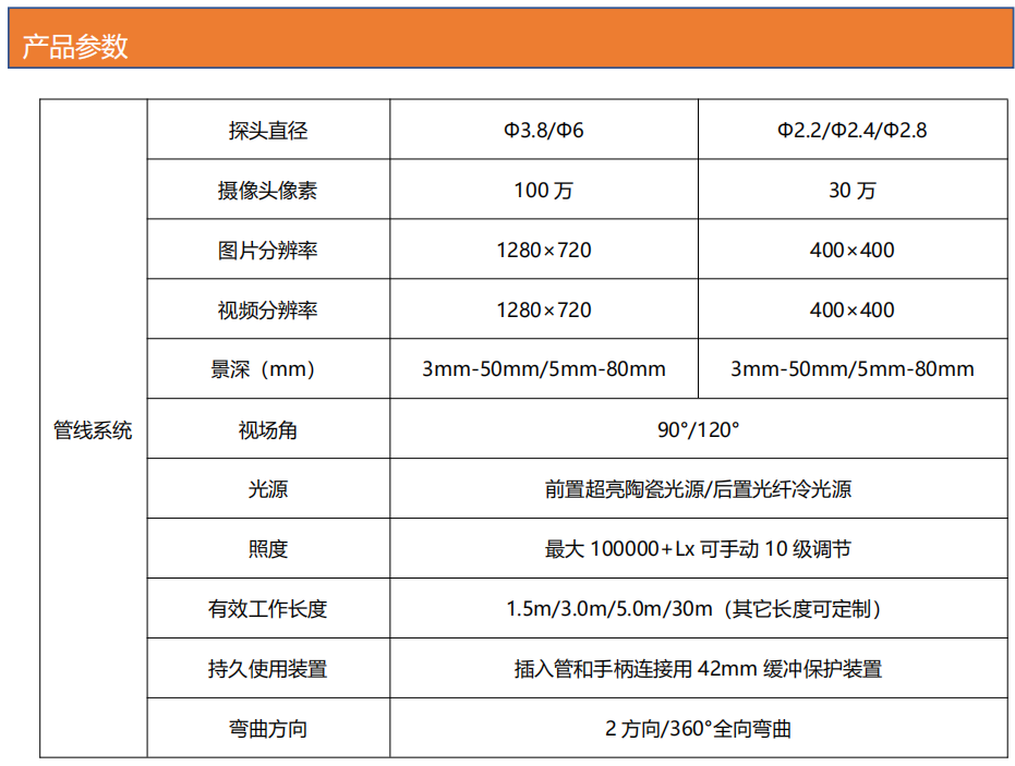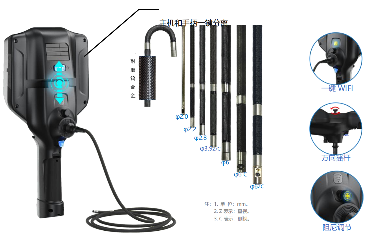 ***清內窺鏡采用模塊化設計,主機與手柄可一鍵分離。并且兼容 2.0mm/2.2mm/2.8mm/3.9mm/6mm 的管線系統,同時也兼容 3.9mm 側視管線、6mm 側視管線、6mm 直側視管線。產品幾乎滿足了各種檢測現場的需求。