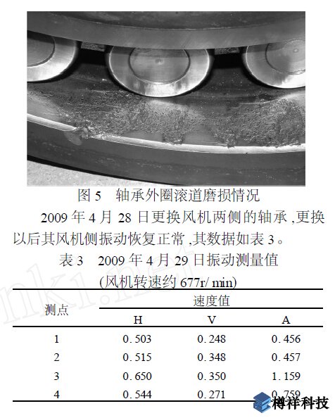 2009 年4 月27 日,對此風機進行停機檢修,拆開該滾動軸承,發現其滾動體及內外圈滾道存在非常嚴重的磨損、剝落情況,與診斷結論相吻合,如圖4、圖5 所示。