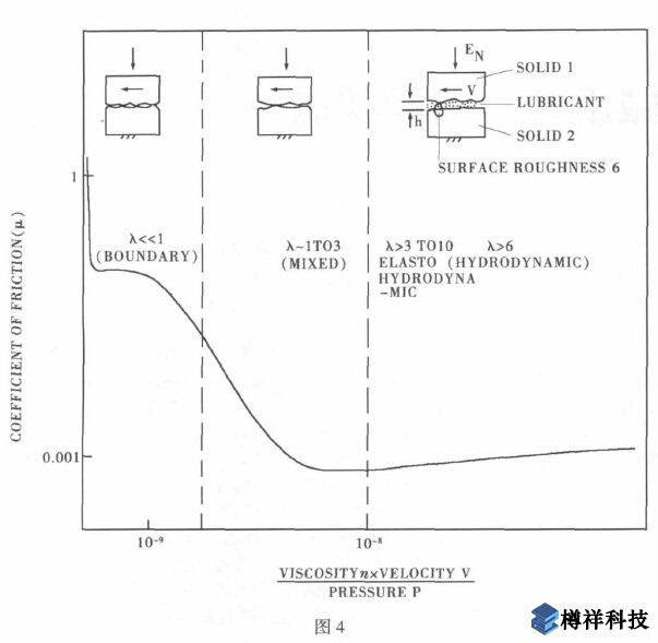 如前所述,Streibeck 曲線的建立是以滑動軸承為基礎的,其橫坐標采用滑動軸承特性數Zn/p 是很合理的選擇(其意義與Sommerfield 數ηω/p 相同)。但是隨著摩擦學的發展,研究對象日益豐富和多樣化,僅用這個參數來表示摩擦副表面間的隔離程度是具有局限性的。美***的Hamrock 教授提出, 為使Streibeck 曲線更具普遍性,將橫坐標改為油膜厚度與表面粗糙度之比(比膜厚Specific Film Thickness)λ。
