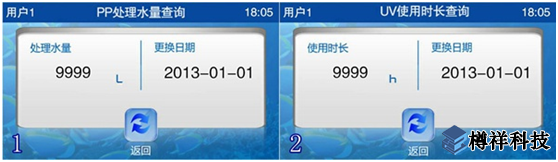 ◇ 在耗材使用查詢畫面中點擊UV使用時長,出現UV使用時長查詢畫面(圖2)。畫面顯示已處理水量及前次更換耗材日期。