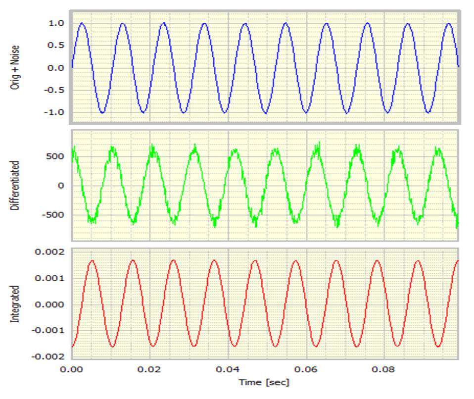 這里原始信號的噪聲很明顯。差分信號實際上是無用的,但集成信號相對干凈。為了說明這一點,嘈雜的正弦波被區分了兩次。結果如下所示。原始正弦波的所有痕跡似乎已經消失,或者更確切地說,已經在噪音中消失了。