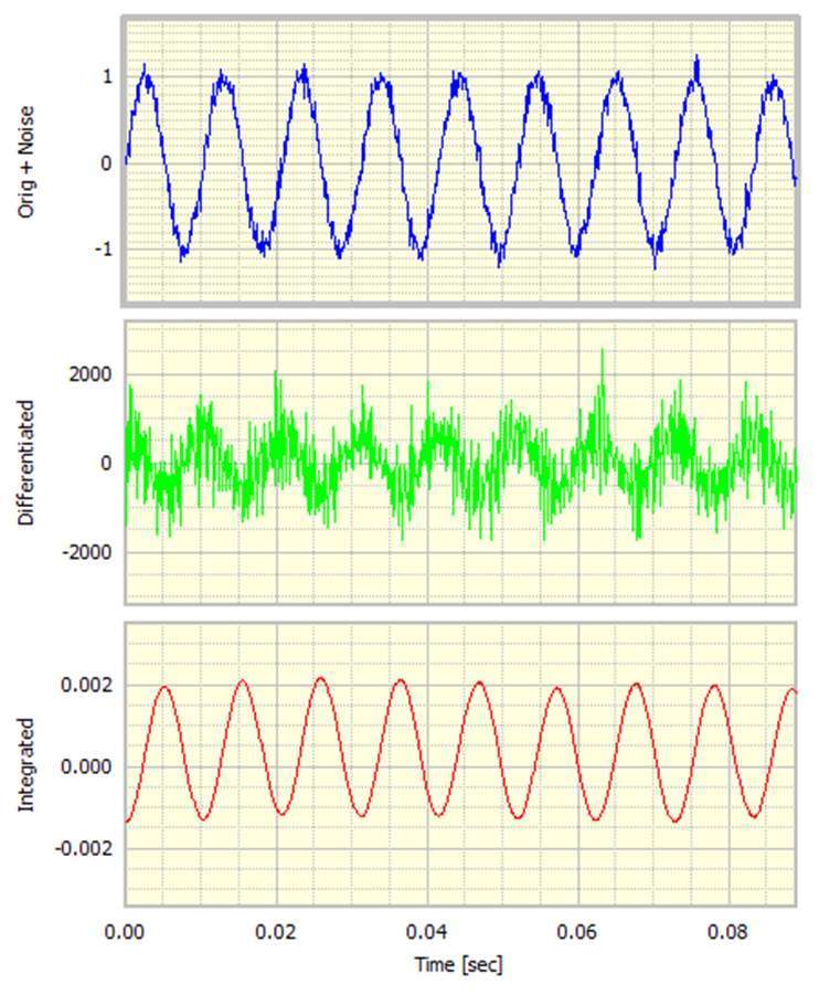 注意,在這個時刻,當我們進行微分時,我們不必對初始信號做任何事情,但是我們必須在積分之前去除任何DC偏移以防止“漂移”并且還從集成信號中去除DC偏移消除整合的常數。因此,在這個階段,人們可能會試圖得出結論,使用差異化方案可能是***好的前進方式。但是,當我們添加噪音時情況會發生變化。