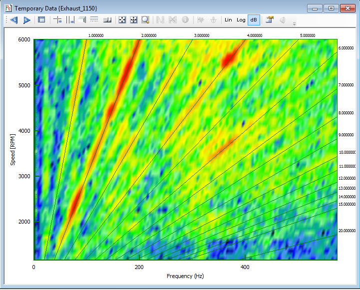 現在我們可以清楚地看到速度相關噪聲的線性特性。這在瀑布圖中顯示為傾斜線。因為這是一個四缸四沖程發動機,主導頻率是旋轉速度的兩倍或二次諧波。在旋轉機械的情況下,我們稱之為第二順序。