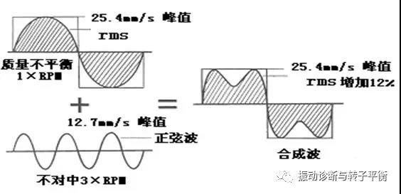 在這個例子中,有兩個頻率成分,一個是速度峰值為25.4mm/s 的 1 倍頻,另一個頻率成分是速度峰值為 12.7mm/s的倍頻。這兩個頻率成分復合產生了所示的合成波形。注意合成波形的速度峰值是25.4mm/s,與1倍頻分量的幅值相等。通過比較發現,合成波形的 RMS 值,或者說是矩形里的陰影區域增 加12%。換句話說,如果采用峰值響應進行測量,由于頻率成分的復合,可能出現合成波形的峰值小于振動主頻的峰值,但是使用 RMS 測量,合成波形的幅值與頻率成分的相對相位關系無關。