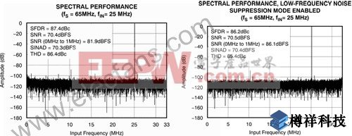 但是,1MHz 頻帶中測得的 SNR 為 81.9dBFS,因為基帶上存在 1/f 噪聲。一旦噪聲抑制模式被激活,該頻帶中測得的 SNR 便提***到 86.1dBFS。1MHz 帶寬中測量值(86.1dBFS)超出預期值(70.4+15.1=85.5dBFS)的這一事實具有誤導性,因為它是由一個標準奈奎斯特 SNR(70.4dBFS)計算得到的,而該奈奎斯特SNR 包括了***階諧波(第九階以上),其被當作了噪聲。