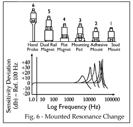 圖中顯示了六種可能的安裝技術及其對典型壓電加速度計響應的影響。(請注意,并非所有安裝方法都適用于您的特定傳感器。)